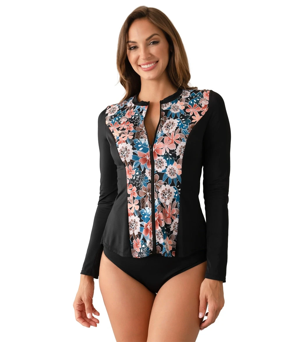 The Fit4U Women’s Moon Shadow Zip Long Sleeve Swim Shirt is perfectly Fit 4 ALL!Fully covered back with long sleeves provides maximum sun protection for arms, shoulders, chest, and back. Solid blocking at the sides and sleeves visually takes off inches from the midriff. This multi-functional top has sewn-in soft cups with a wrap-around bra that supports and lifts, and a full-length functional zipper that allows you to fit this style perfectly 4 U.An excellent option for water sports enthusiasts or those that just want to cover up.